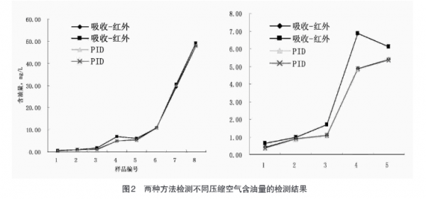 采用PID檢測法檢測過程中發(fā)現(xiàn),PID檢測法是一種非破壞性檢測法,不會改變待測氣體分子,經(jīng)過PID檢測的氣體仍可被收集繼續(xù)使用,因此,PID檢測法可考慮用于壓縮空氣含油量的在線監(jiān)測。