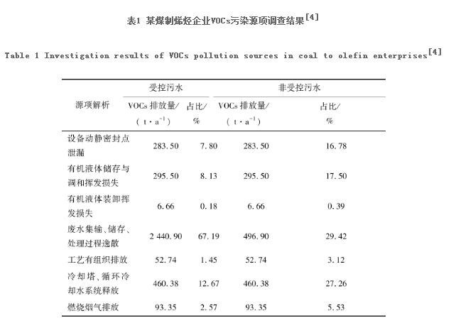 目前,我國只有少數(shù)現(xiàn)代煤化工企業(yè)開展了VOCs核查。表1為某煤制烯烴企業(yè)VOCs的源項核查結果(將氣化灰水及污水汽提塔底凈化水分為受控污水和非受控污水2種情況)[4]。