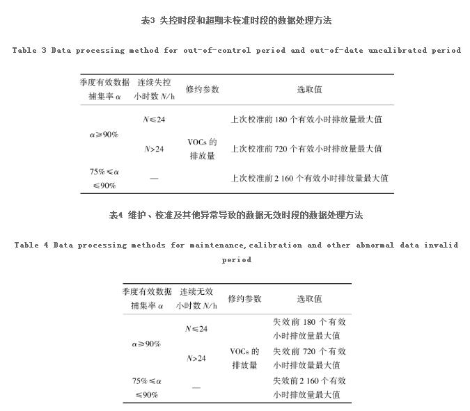 數(shù)據(jù)審核方面,可參照HJ 75提出有效數(shù)據(jù)捕集率全年必須達75%。失控時段的數(shù)據(jù)可按照表3中的方法對VOCs排放量進行修約,非甲烷總烴濃度和廢氣參數(shù)不修約。故障期間、維修期間的數(shù)據(jù),可使用參比方法監(jiān)測的數(shù)據(jù)替代,也可按照表4中的方法對VOCs排放量進行修約,非甲烷總烴濃度和廢氣參數(shù)不修約。當采用參比方法監(jiān)測的數(shù)據(jù)替代時,頻次不低于每天1次,參比方法的監(jiān)測過程按照GB/T 16157、HJ/T 397、HJ 732、HJ 38要求進行,替代數(shù)據(jù)包括非甲烷總烴濃度、廢氣參數(shù)和VOCs排放量。維護保養(yǎng)和校準及其他異常導致的數(shù)據(jù)無效時段,VOCs排放量按照表4處理,非甲烷總烴濃度和廢氣參數(shù)不修約。