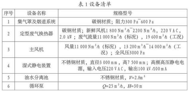 系統(tǒng)包括:定型廢氣換熱系統(tǒng)、濕式靜電裝置系統(tǒng)、主風(fēng)機等,主要設(shè)備參數(shù)見表1。