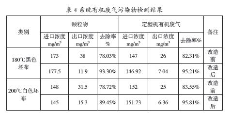 該文所提出的紡織印染定型機有機廢氣凈化處理技術(shù)工藝,即在原定型有機廢氣濕式靜電處理系統(tǒng)的基礎(chǔ)上進(jìn)行技術(shù)改造,新增加了活性炭吸附、再生處理和催化氧化裝置系統(tǒng),VOCs總的脫除效率達(dá)到95%以上。通過現(xiàn)場實際檢測顆粒物除效率為93.3%和89.45%,VOCs總的脫除效率為95.21%和95.81%。