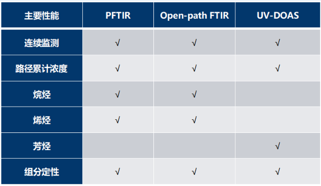 被動(dòng)式傅立葉變換紅外光譜技術(shù)(PFTIR)、開放光路長光程傅立葉變換紅外光譜技術(shù)(OP-FTIR)、開放光路長光程紫外差分吸收光譜技術(shù)(UV-DOAS)等。