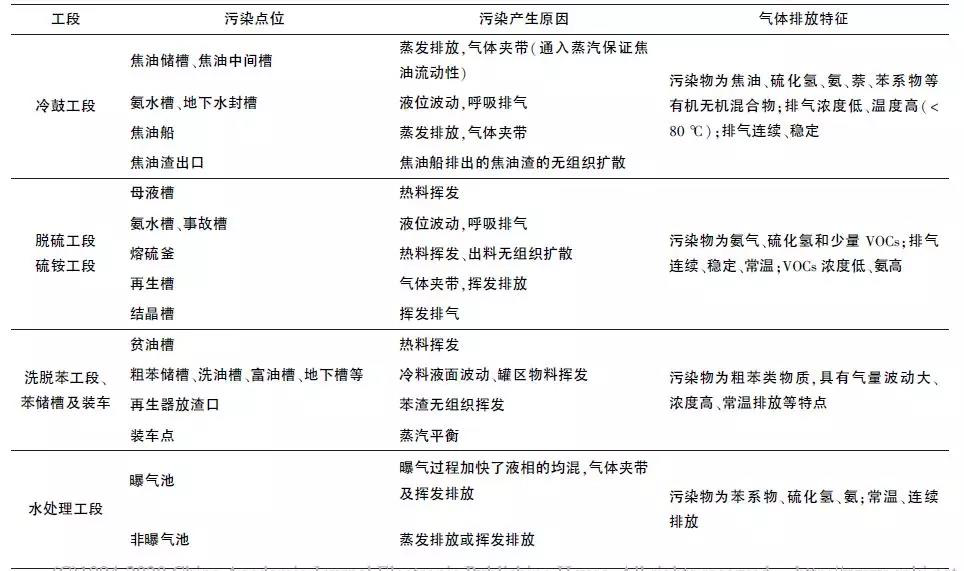 焦化 VOCs廢氣排放點(diǎn)位及產(chǎn)排特征見表