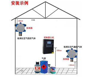 10、對于檢測可燃?xì)怏w比重大于空氣的諸如烷烴類(甲烷沼氣、民用煤氣除外)、烯烴類(乙烯除外),液化石油氣、汽油、煤油時(shí),請將探測器安裝在低于泄漏點(diǎn)的下方平面上,距地面不得高于30cm。并請注意周圍的環(huán)境特點(diǎn),例如室內(nèi)通風(fēng)不流暢部位,地槽地溝容易積聚可燃?xì)怏w的地方,現(xiàn)場通往控制室的地下電纜溝,有密封蓋板的污水溝槽等,都是經(jīng)常性的或在生產(chǎn)不正常情況下容易積聚可燃?xì)獾膱鏊瑢τ谶@些環(huán)境都是不可忽視的安全監(jiān)測點(diǎn)。
