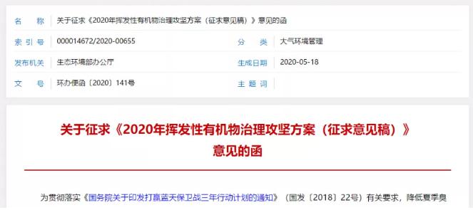 為貫徹落實(shí)《國(guó)務(wù)院關(guān)于印發(fā)打贏藍(lán)天保衛(wèi)戰(zhàn)三年行動(dòng)計(jì)劃的通知》(國(guó)發(fā)〔2018〕22號(hào))有關(guān)要求,降低夏季臭氧污染影響,前幾日,生態(tài)環(huán)境部組織編制了《2020年揮發(fā)性有機(jī)物治理攻堅(jiān)方案(征求意見稿)》。