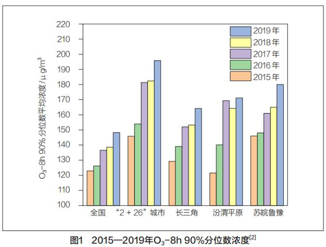 自2013年相繼實(shí)施《大氣污染防治行動(dòng)計(jì)劃》《打贏藍(lán)天保衛(wèi)戰(zhàn)三年行動(dòng)計(jì)劃》以來(lái),我國(guó)環(huán)境空氣質(zhì)量改善效果明顯,空氣中二氧化硫(SO2)、二氧化氮(NO2)、可吸入顆粒物(PM10)、細(xì)顆粒物(PM2.5)、一氧化碳(CO)濃度顯著下降,尤其是PM2.5污染控制取得顯著成效,但是臭氧(O3)污染卻呈逐年加重的趨勢(shì),O3污染防控形勢(shì)嚴(yán)峻。