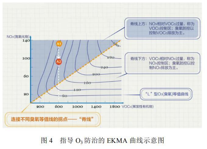 O3生成不僅與前體物VOCs、NOx排放量有關(guān),同時(shí)與兩者的比例密切相關(guān),呈現(xiàn)復(fù)雜的非線性響應(yīng)關(guān)系。經(jīng)典的EKMA曲線可用于揭示VOCs和NOx生成O3的復(fù)雜關(guān)系[3](見(jiàn)圖4),在VOCs和NOx為坐標(biāo)軸的圖上,O3等值曲線是一條條近似等高線的“L”型曲線,連接不同O3等值線的拐點(diǎn)可以形成一條“脊線”,在脊線上方,NOx相對(duì)VOCs過(guò)量,稱為VOCs控制區(qū)—O3防控以控制VOCs排放為主;在脊線下方,VOCs相對(duì)NOx過(guò)量,稱為NOx控制區(qū)—O3防控以控制NOx為主。在VOCs控制區(qū),VOCs排放保持不變,減排NOx,O3濃度有可能上升。相關(guān)研究表明,我國(guó)O3污染重點(diǎn)區(qū)域總體上為VOCs與NOx協(xié)同控制區(qū),但多數(shù)市區(qū)為VOCs控制區(qū),主要受烯烴、芳香烴和醛類的控制。因此,“十四五”期間O3控制應(yīng)強(qiáng)調(diào)VOCs和NOx協(xié)同減排,特別是應(yīng)加大VOCs的減排力度。
