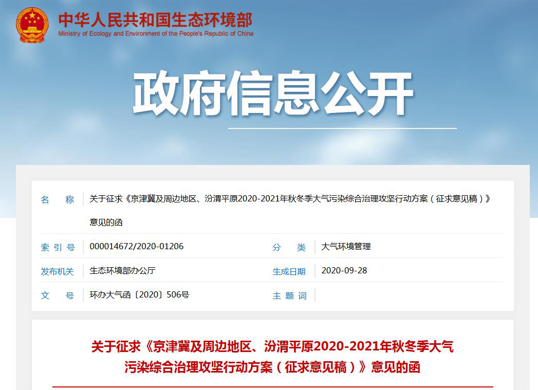 日前,生態(tài)環(huán)境部發(fā)布《京津冀及周邊地區(qū)、汾渭平原2020-2021年秋冬季大氣污染綜合治理攻堅行動方案(征求意見稿)》。