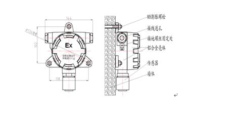 安裝方法:在墻上畫好安裝孔,使用8mm×100mm膨脹螺栓,在墻面固定好的膨脹螺栓,將變送器安上,再用螺母加彈墊和平墊固定好,見圖5。安裝高度根據(jù)測試的氣體不同而不同,原則上比空氣輕的氣體安裝在泄露源上方,反之 安裝在泄露源下方,具體判斷方法,查看氣體分子量,如果比28小,則比空氣輕,如果比28大,則比空氣重,變送器固定好后將上蓋卸下,從進線口引入兩芯電纜(Ex型為三線制)。按正負(fù)極性接入接線端子(Ex型圖示連接)見結(jié)構(gòu)圖,然后鎖緊防水接頭,各環(huán)節(jié)檢查無誤后,將上蓋擰緊。