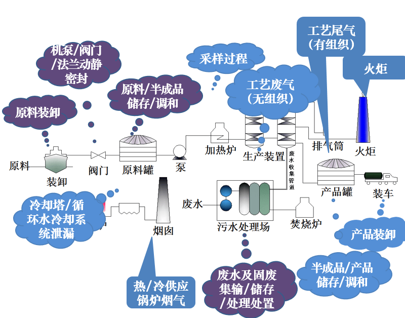 煉油與石油化工行業(yè)VOCs排放以無組織排放為主,VOCs無組織排放占全廠排放的90%以上,主要以有機液體存儲與調(diào)和揮發(fā)、廢水收集及處理過程、設備動靜密封點泄漏、有機液體裝卸揮發(fā)、冷卻塔和循環(huán)冷卻水系統(tǒng)等5個源項排放為主。